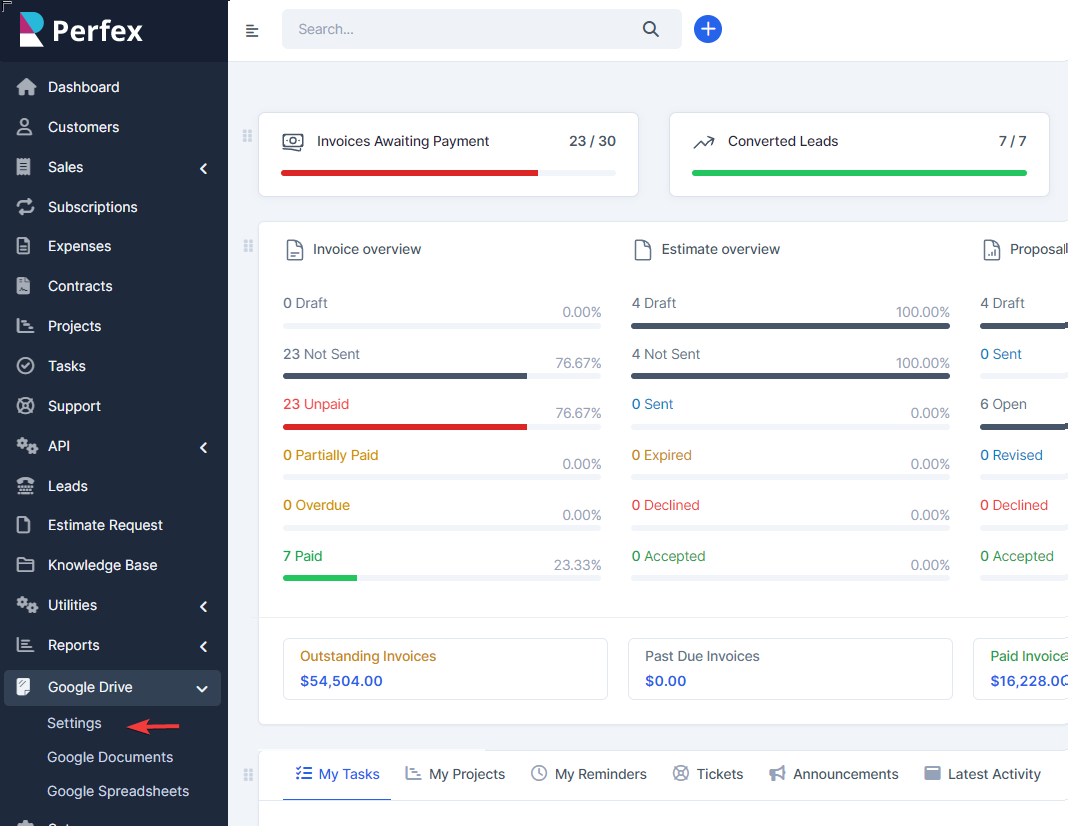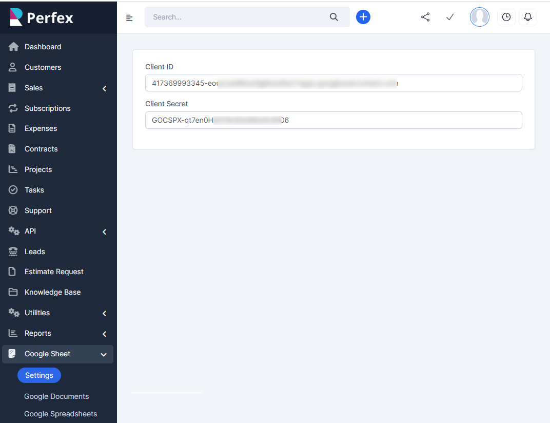 Agora você pode colar as credenciais fornecidas nas configurações do nosso módulo e Criar, Editar e Gerenciar Planilhas do Google dentro do Perfex CRM!